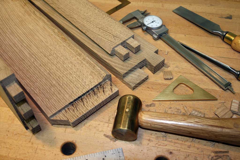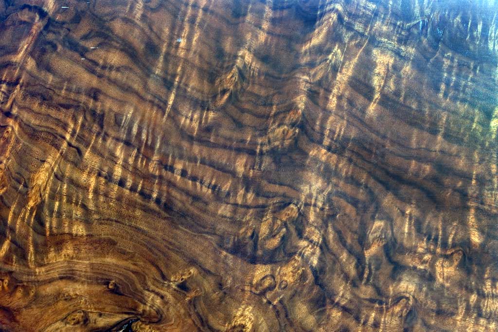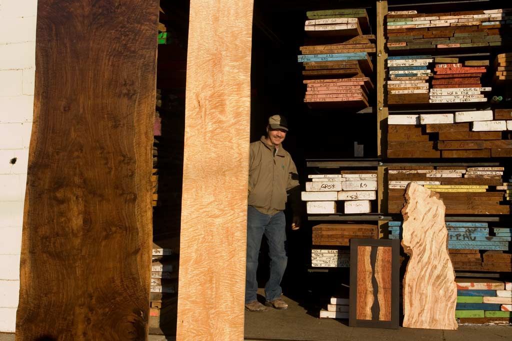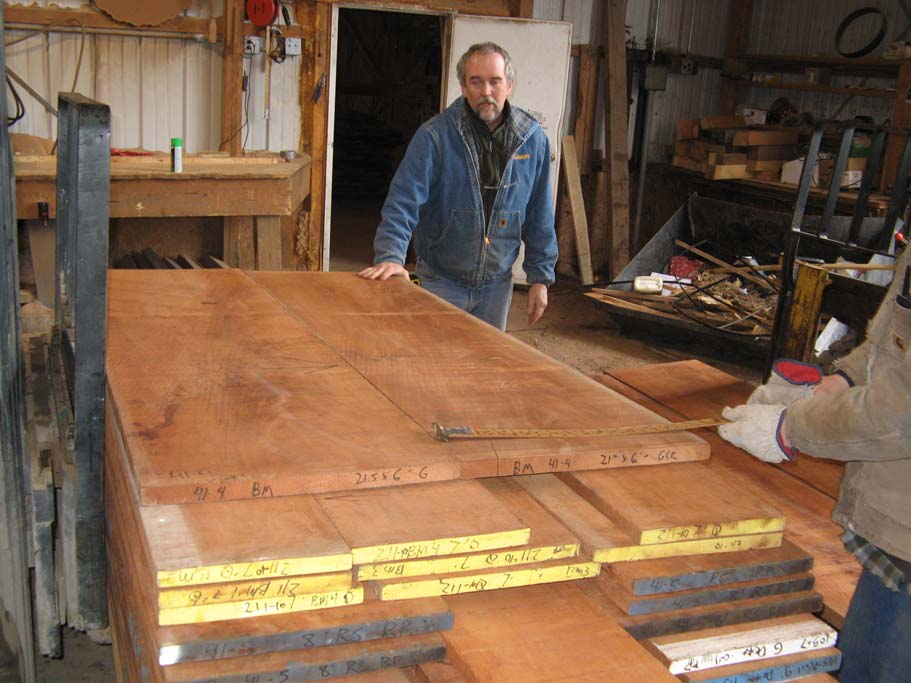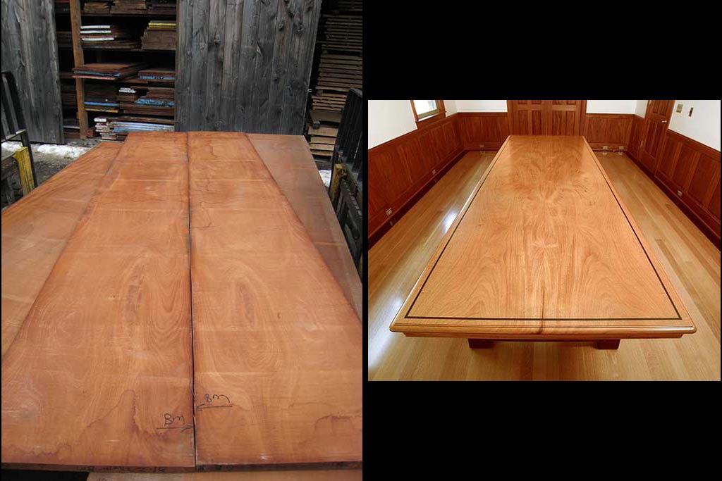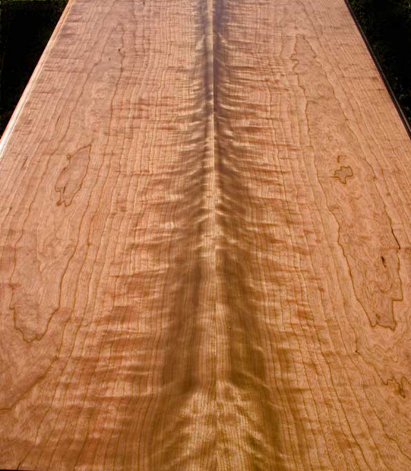 The inspiration for our woodwork most often comes directly from the material. Over the course of the last 30 years, we have gained a wonderful assortment of great sources for great material. Finding the material is a labor of love, and inspiring us with ideas. It is a privilege to have an oppourtunty to work with some of the finest woods in the world. Our whole company is committed to honoring the material with the best craftsmanship and design possible. Our largest influence, the work of architects Charles and Henry Greene, especially after they started working the Hall Brothers, master craftsmen who helped them take their work to what in our opinion, is the height of design and craftsmanship, integrating the entire built environment into their projects. On the left you see a pair of sequential boards, each over 24" wide. Finding this material and seeing the symmetry presented by its bookmatching, yielded the 4' x 12' conference table on the right. The wood usually directs our design. We travel broadly to connect with a great selection of rare material. The bubinga panel on the left was made after we saw how beautiful the scrap from the edge of the tree was. The unusual maple next to it is heavily marked by ambrosia beetle trails. The quality, talent and creative abilities of our staff inspire much of the work we do. Our craftsmen love the one of a kind oppourtunities we often get and they bring so much to the table that the original designs often evolve with their input. Shop manager Scott Todd visiting some of our lumber racks. From 40"+ slab of Claro Walnut on the left to the incredibly curly maple and racks of full mahogny, we usually can put our hands on just the right wood for the project at hand. If we don't stock it, we have a great network of reliable small suppliers who we work with regularly and can trust to help us produce it. This signature desk design was almost totally inspired by the curly mahogany which lights up from the inside when light finds its surface. A close up of claro walnut from the west coast waiting for the right client. We bought an entire tree when we saw how curly this maple was. Wood this unique must be used together with wood from the same tree as it would easily look out of place with any other maple. This two board cherry top appears to turn three dimensional as you walk around it. The strong symmetry brought by two bookmatched pairs is hard to beat for table or desk tops.
