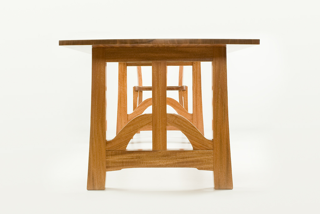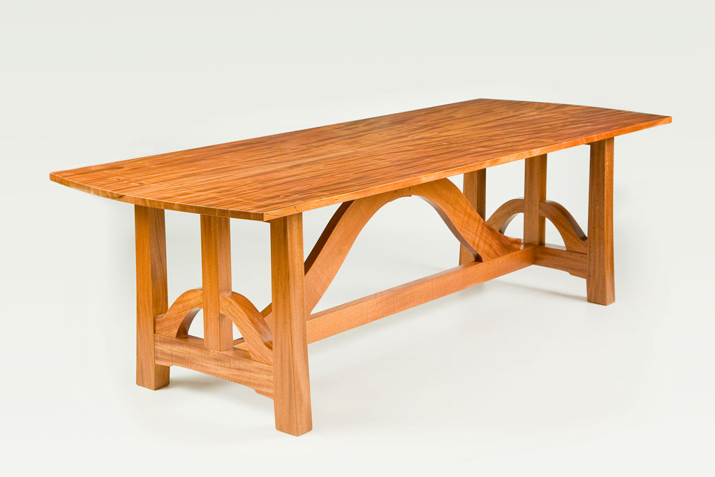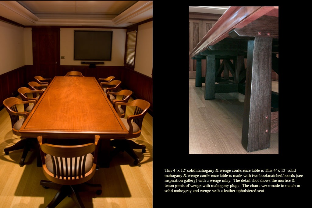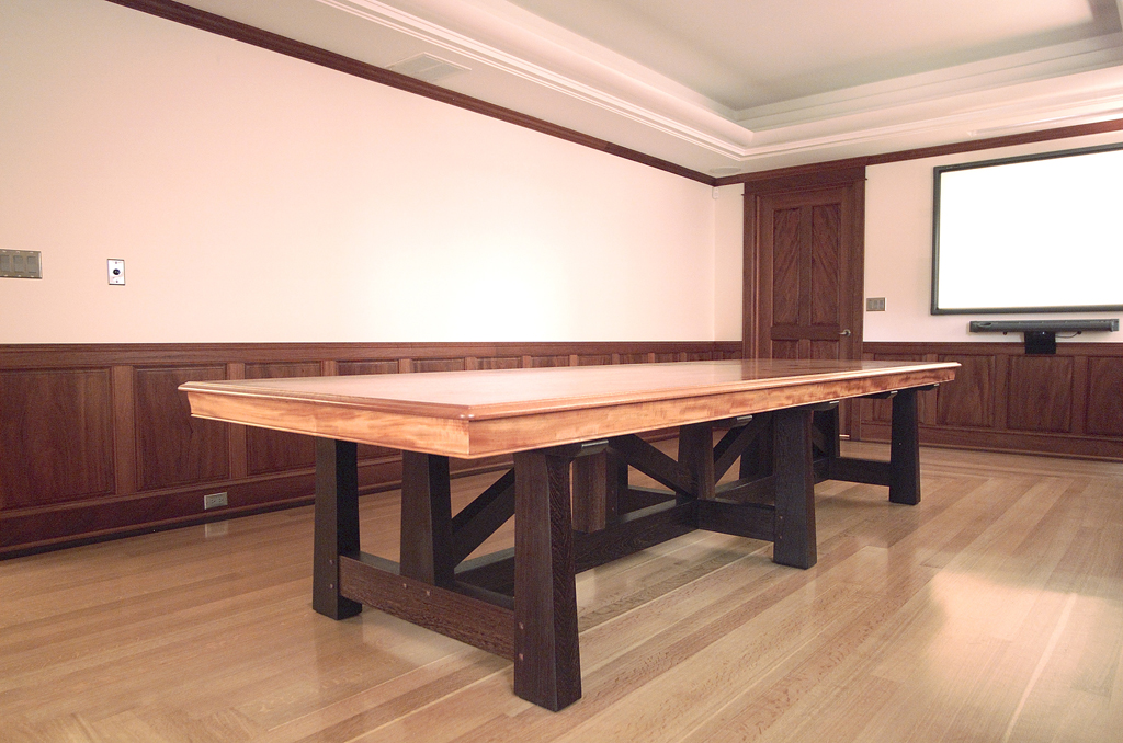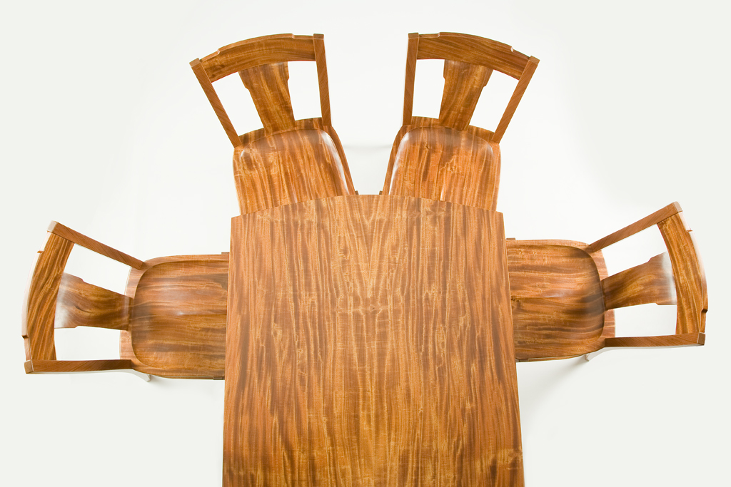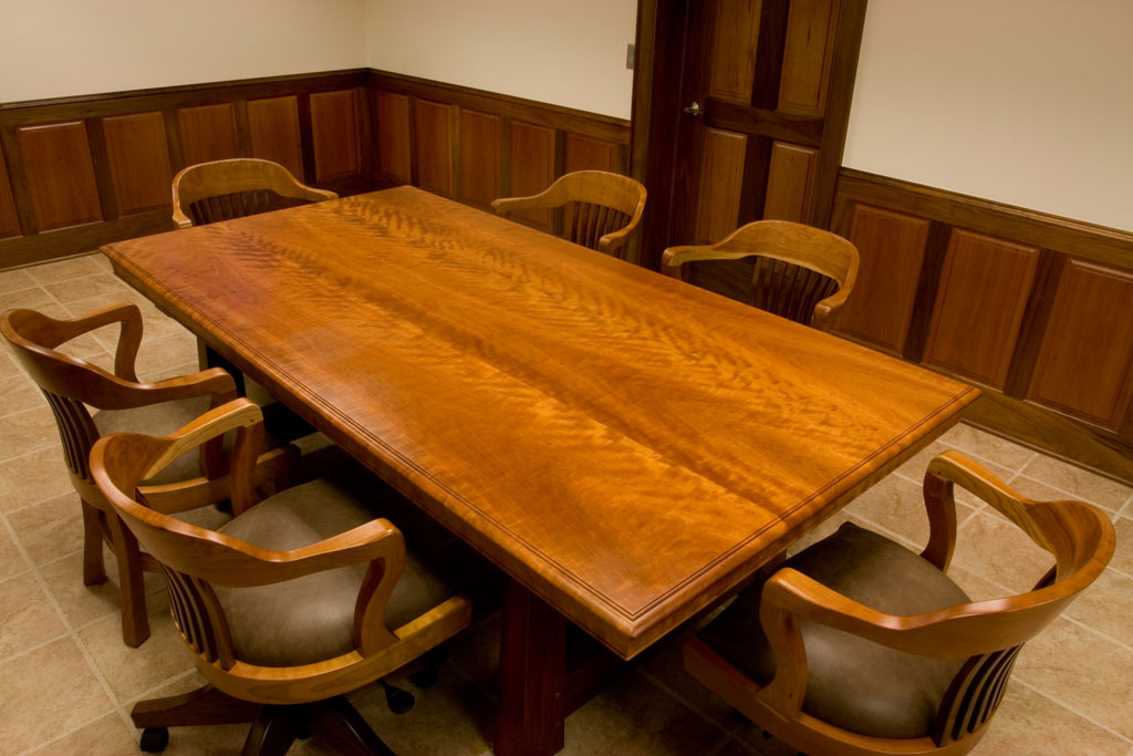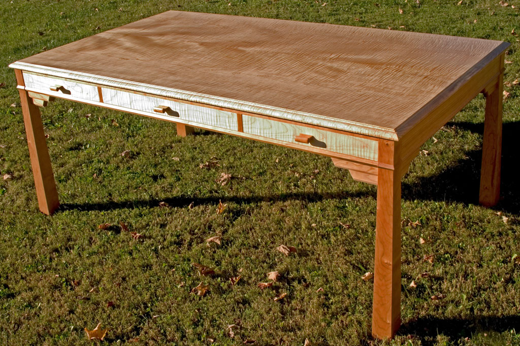 One incredible log of ribbon grain mahogany inspired this dining room table and chairs. Designed after a week touring Greene & Greene houses in Pasadena, this table featured curved bracing and a bookmatched top. Looking down from above, you can see the same log grain and figure, which led the design. When you have an opportunity to work with material this wonderful, it is an honor and a responsibility to feature it. Looking through the legs to a chair at the end, we tried to maintain a clean and simple form. The chairs show our G&G influence with the use of the cloudlift form. We had a 52" white oak log custom sawed in the quartersawn technique by Guy Bowers, one of the finest sawyers we know. Our commission was to build a dining / work table that celebrated quartersawn white oak. Our design was totally focused on the rare material. The bookmatched material is especially difficult in quartersawn white oak since the medulary ray figure is so thin. The table was a play of curves, but we tried to keep the design in the background to not overpower the wonderful quartersawn white oak. The top of the conference table shows the symmetry of the two board top with a wenge inlay. A 4' x 8' cherry and walnut conference table with an old trestle inspired leg system. The same cherry and walnut conference table with its matching chairs and after it had a year to patina to its darker cherry color. This curly maple and cherry map table features drawers and bracketed legs.