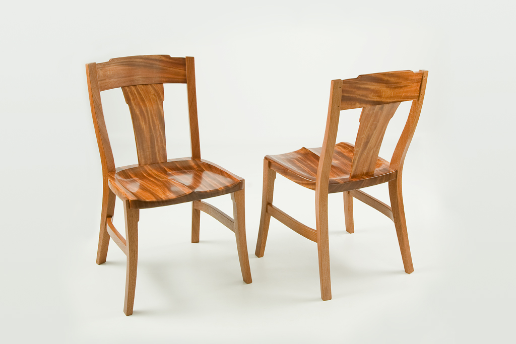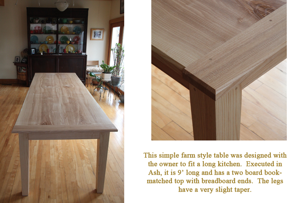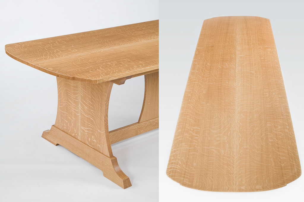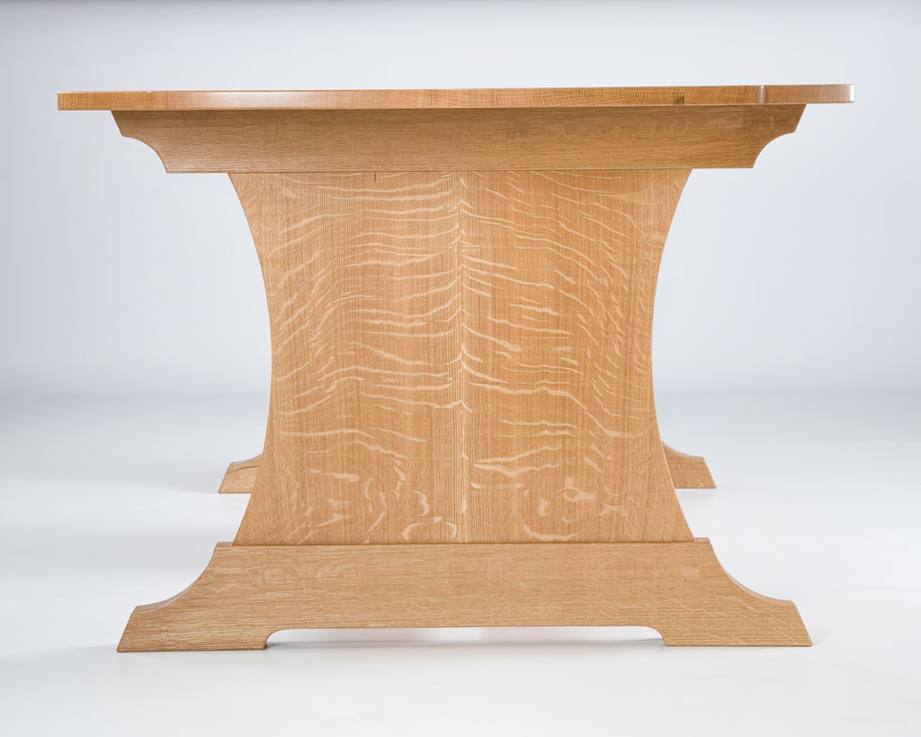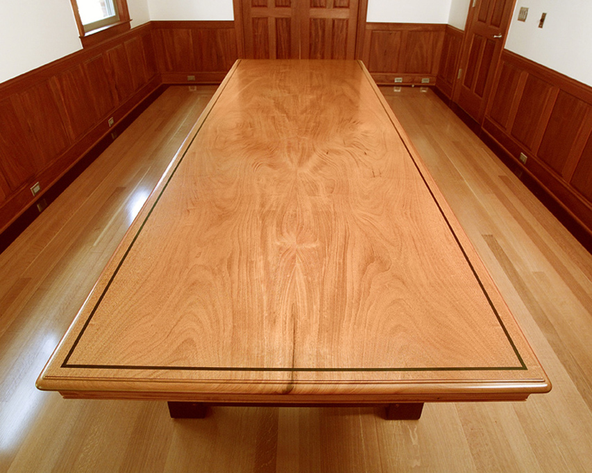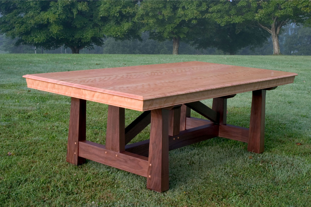 One incredible log of ribbon grain mahogany inspired this dining room table and chairs. Designed after a week touring Greene & Greene houses in Pasadena, this table featured curved bracing and a bookmatched top. Looking down from above, you can see the same log grain and figure, which led the design. When you have an opportunity to work with material this wonderful, it is an honor and a responsibility to feature it. Looking through the legs to a chair at the end, we tried to maintain a clean and simple form. The chairs show our G&G influence with the use of the cloudlift form. We had a 52" white oak log custom sawed in the quartersawn technique by Guy Bowers, one of the finest sawyers we know. Our commission was to build a dining / work table that celebrated quartersawn white oak. Our design was totally focused on the rare material. The bookmatched material is especially difficult in quartersawn white oak since the medulary ray figure is so thin. The table was a play of curves, but we tried to keep the design in the background to not overpower the wonderful quartersawn white oak. The top of the conference table shows the symmetry of the two board top with a wenge inlay. A 4' x 8' cherry and walnut conference table with an old trestle inspired leg system. The same cherry and walnut conference table with its matching chairs and after it had a year to patina to its darker cherry color. This curly maple and cherry map table features drawers and bracketed legs.